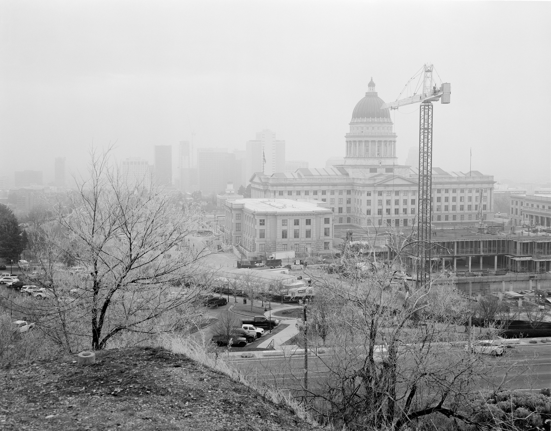 4x5 negative scan. The Utah State Capitol under a blanket of heavy winter inversion.